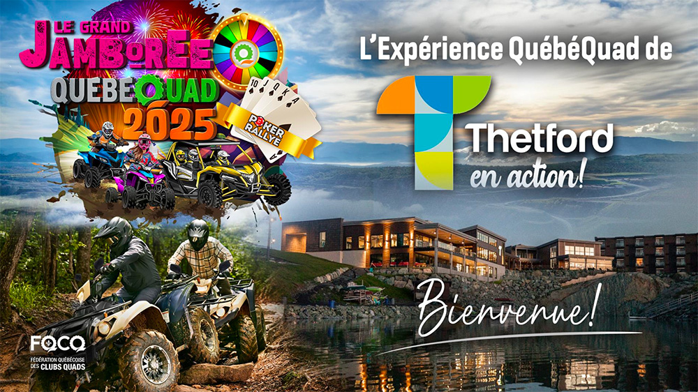 Le Grand Jamboree QuébéQuad 2025 représente parfaitement la force du réseau quad québécois et sa capacité à unir les communautés autour d'un projet commun. Cet événement d’envergure national est rendu possible grâce à une collaboration exceptionnelle entre la FQCQ, le Club Quad Amiante, les autres clubs quads de la région, la Ville de Thetford, ainsi que de nombreux partenaires locaux. Merci également aux bénévoles locaux pour leur engagement exceptionnel qui rendra possible la réalisation de cet événement grandiose !